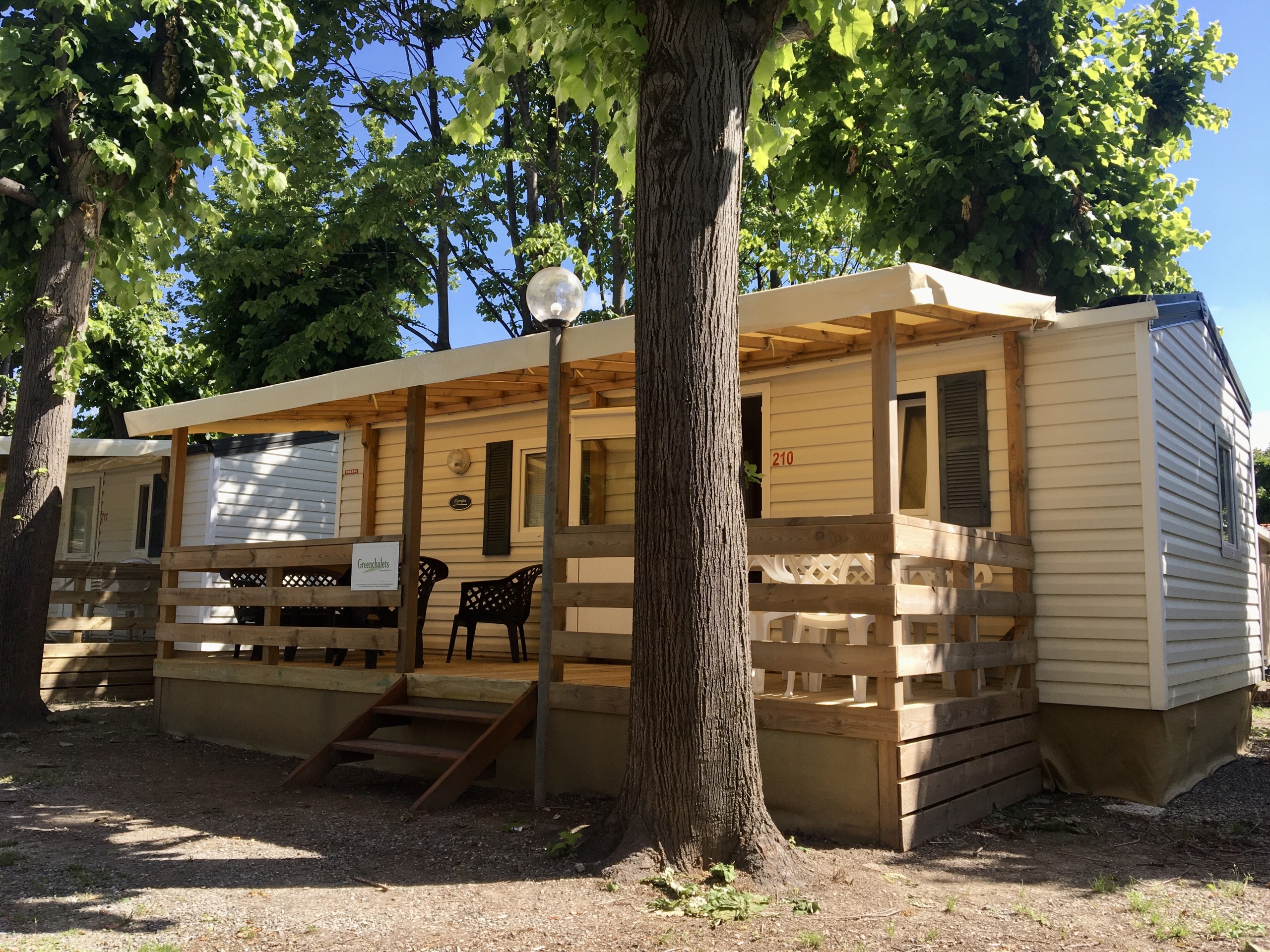 Verder beschikt mobilhome over een ruime veranda en tuin, met daarbij een loungeset en eet set.
